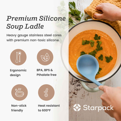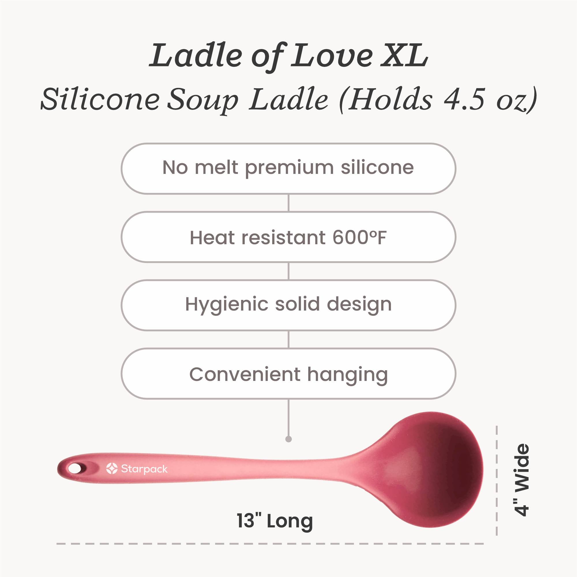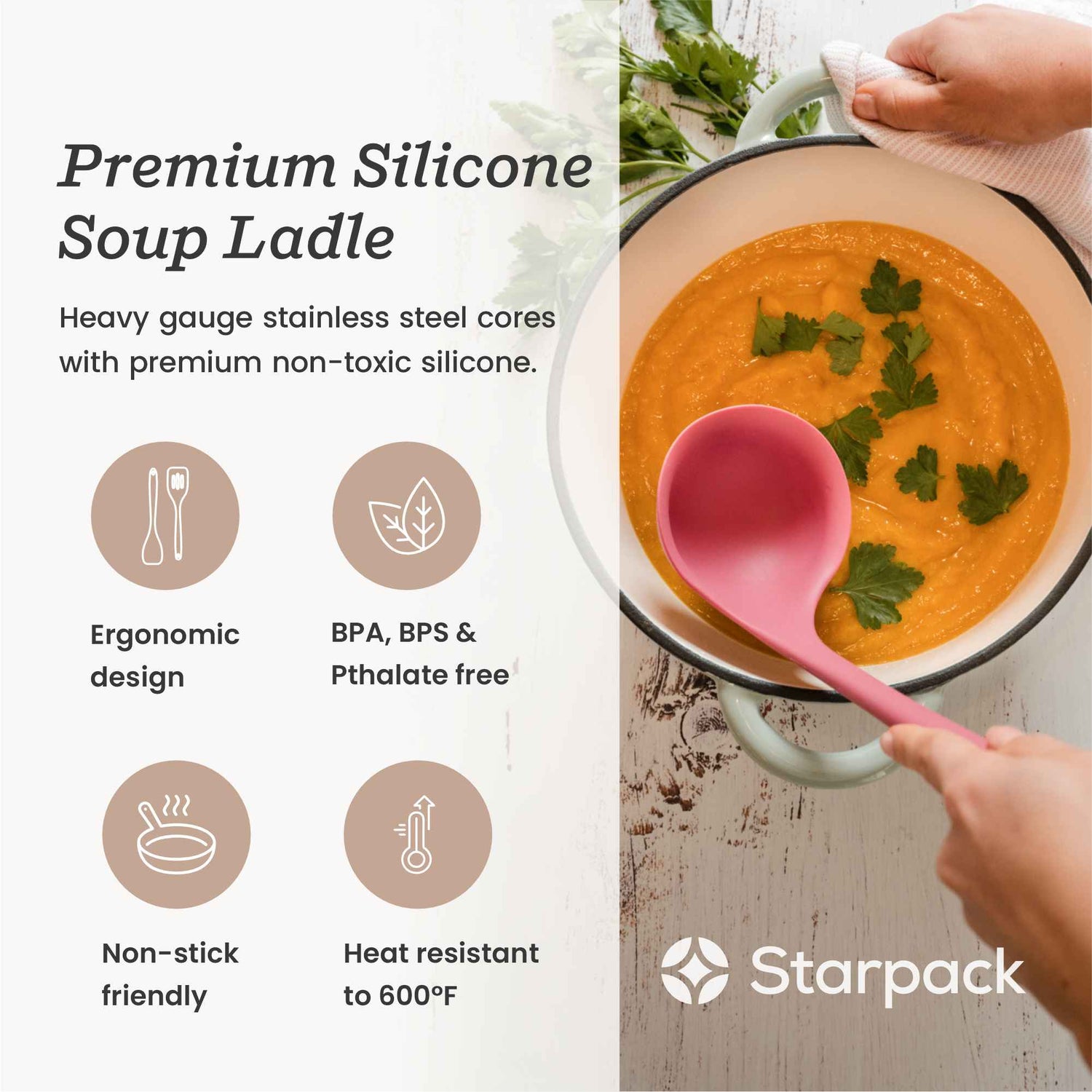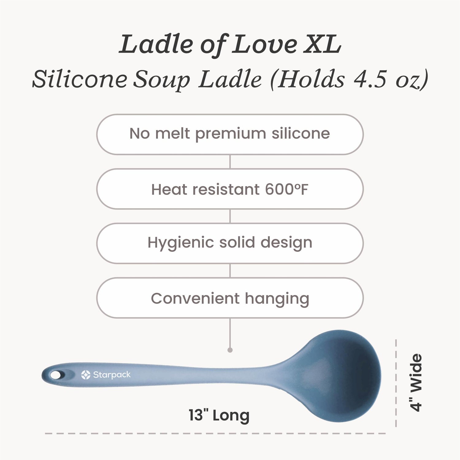 The ladle features a heavy gauge stainless steel core with an ultra-premium, non-toxic silicone outer layer.
