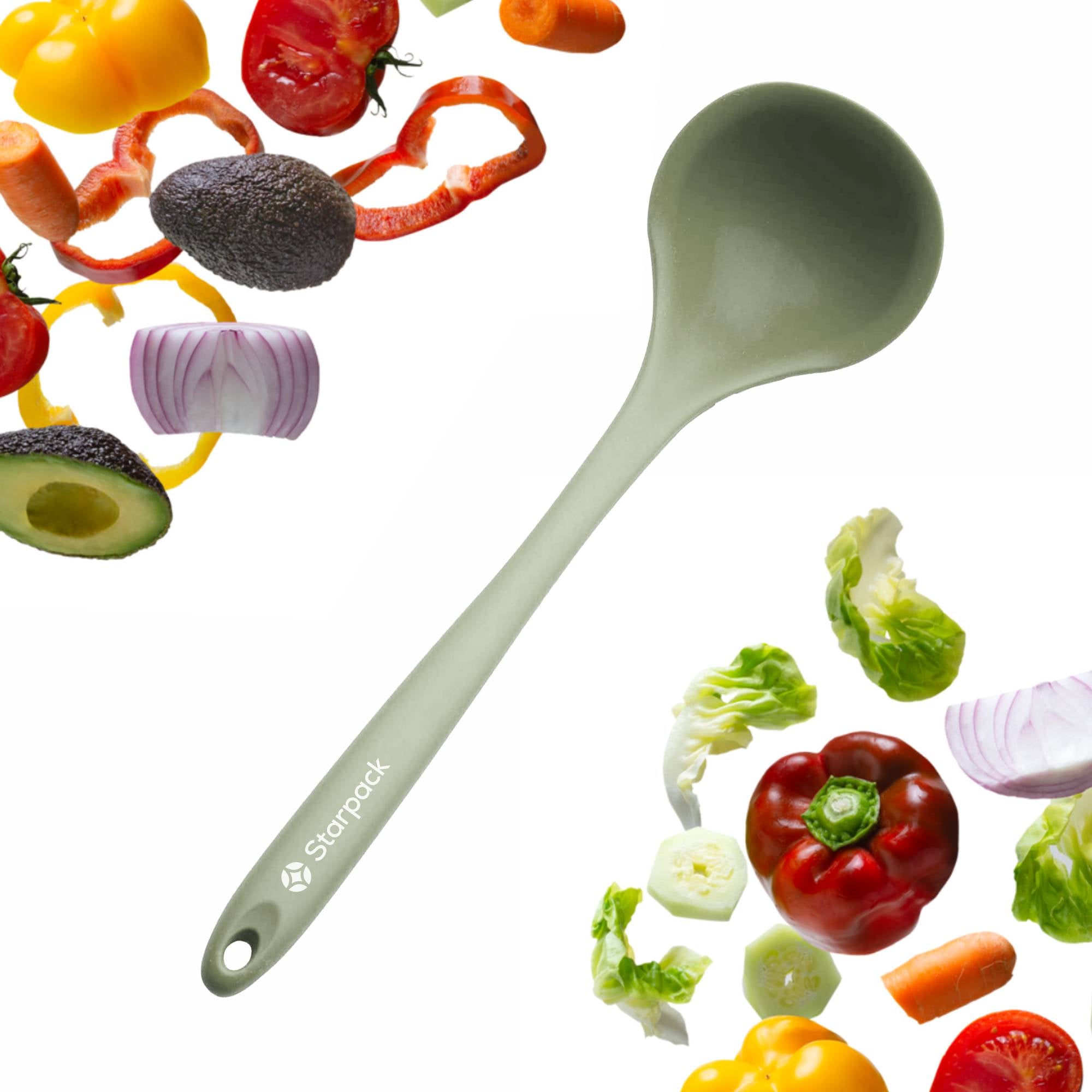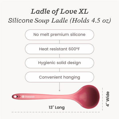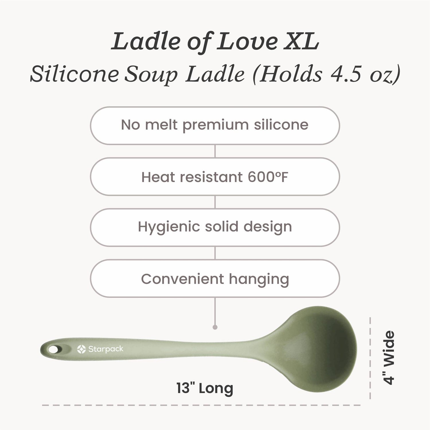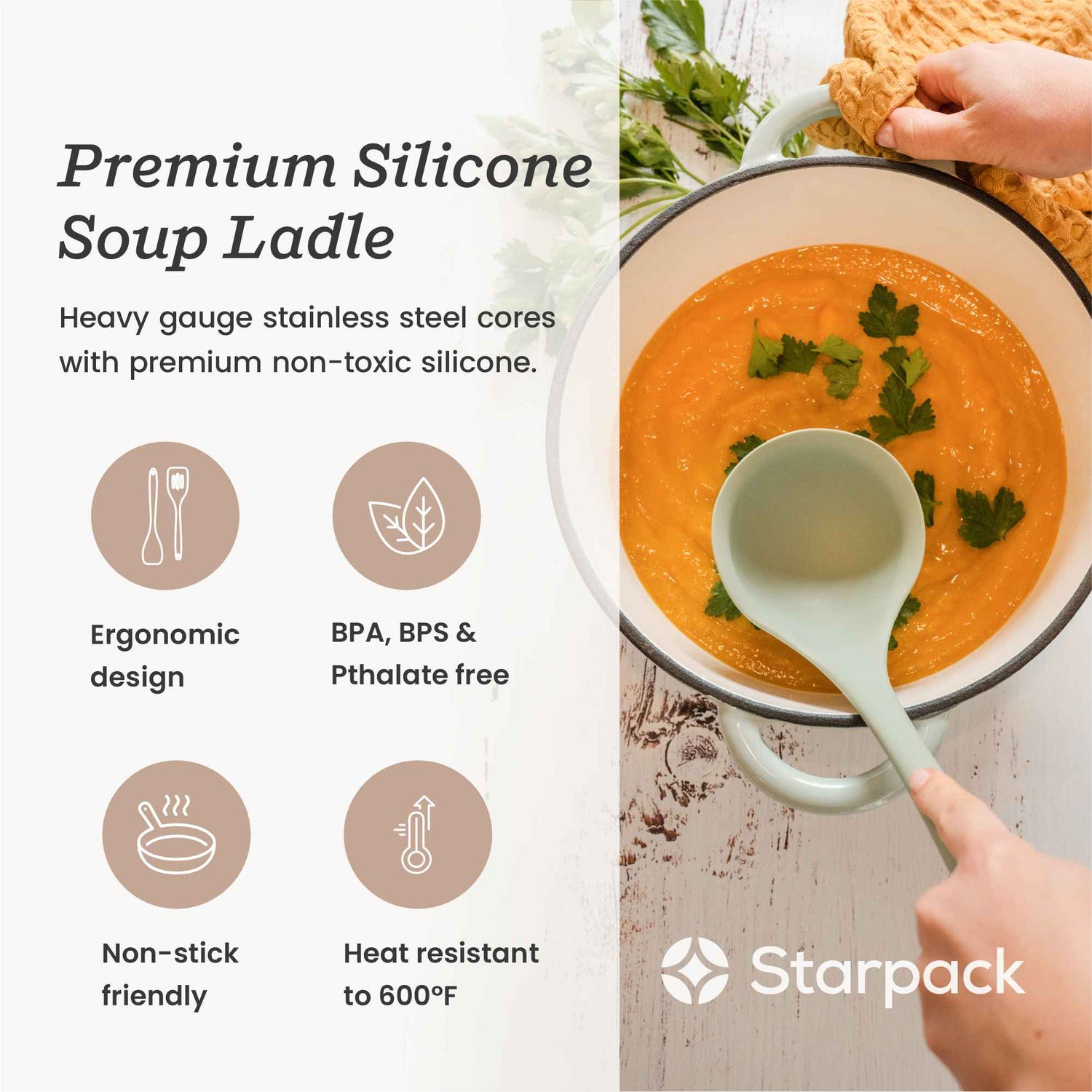 The ladle features a heavy gauge stainless steel core with an ultra-premium, non-toxic silicone outer layer.
