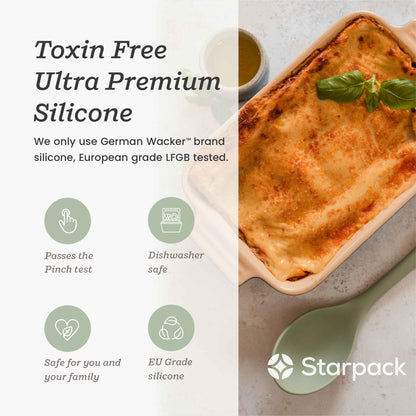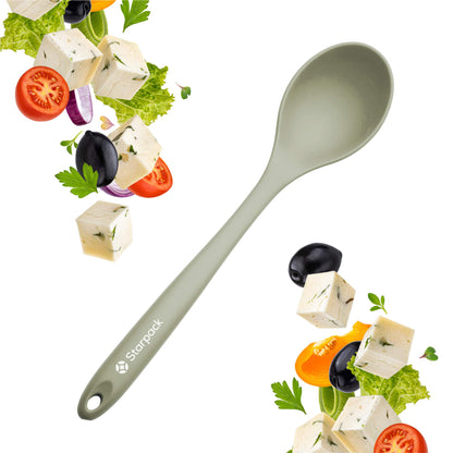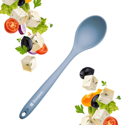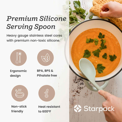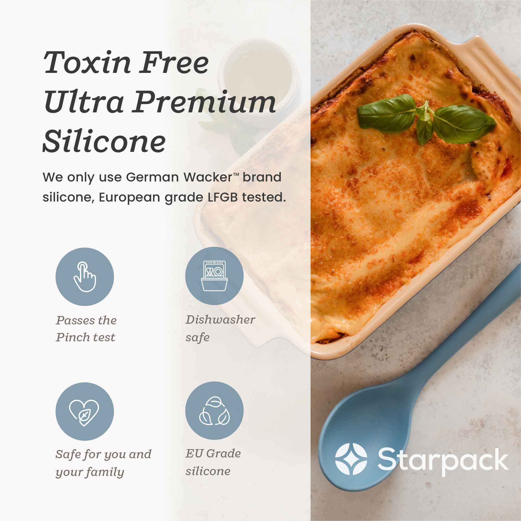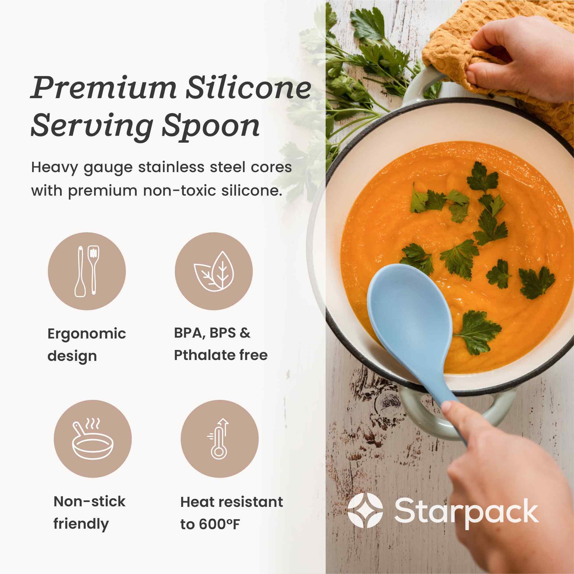 The spoon features a heavy gauge stainless steel core with an ultra-premium, non-toxic silicone outer layer, offering durability and safety.