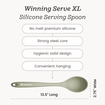 The Winning Serve XL - Serving/Mixing Spoon measures 13.5" in length and 2.75" in width, making it perfect for serving and mixing large portions.